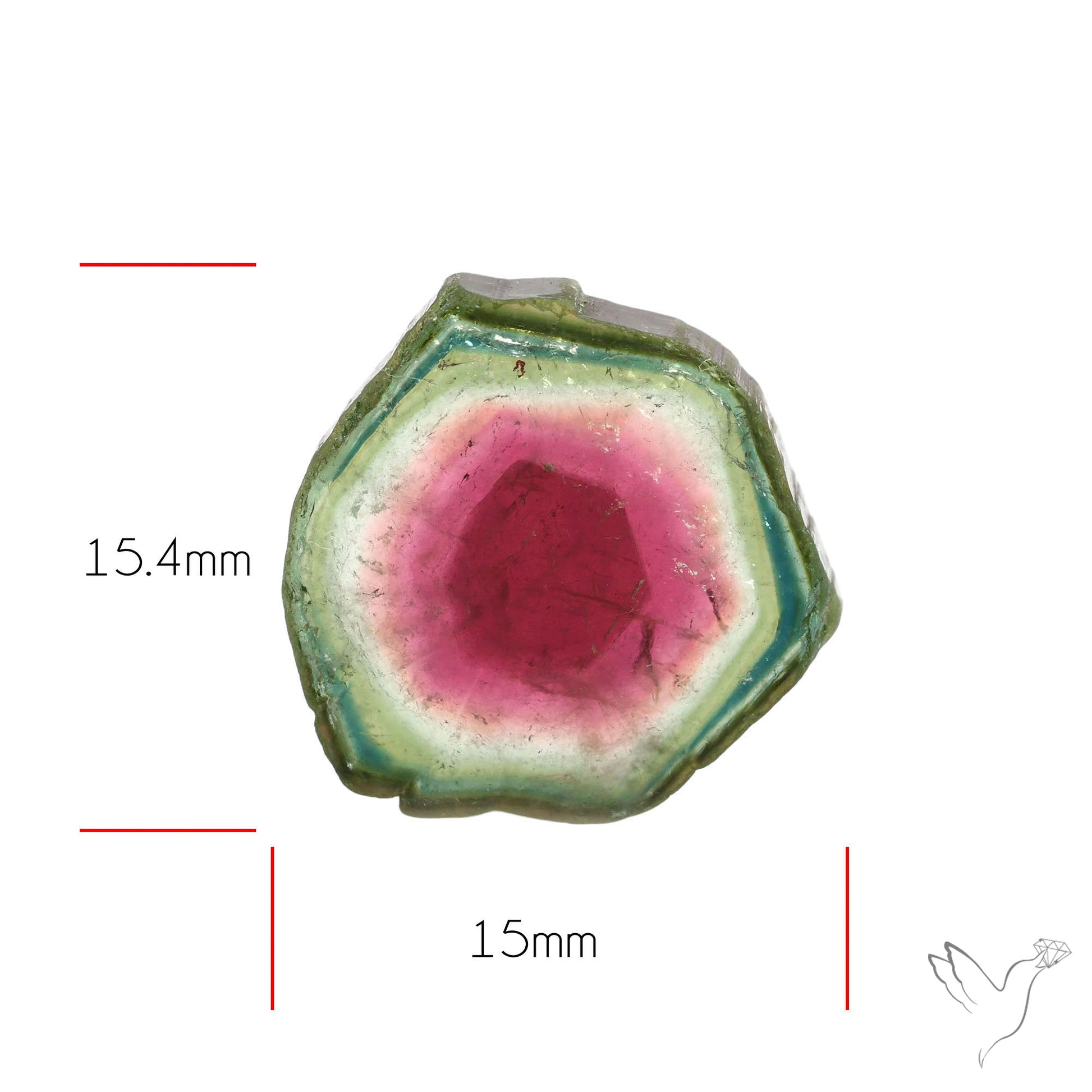 This Watermelon Tourmaline Slice Rare Perfect Green Border N45387 from the India is ready to be delivered as a Natural stone. The stone is available in the size 15.4X15X4.1 mm and weighs 11 Carat. The color of the stone can be expected to be the same as shown. In reference to the picture the number of stone pieces ready to be bought are: 1pc.